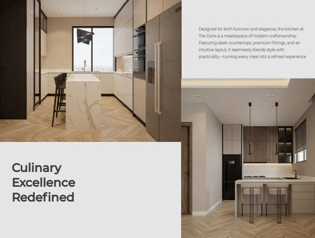 The modern kitchen is fitted with contemporary cabinetry, granite countertops, and high-end appliances, ready to serve a bustling household. Ample parking space, 24/7 security, uninterrupted power supply, and treated water systems all come standard.