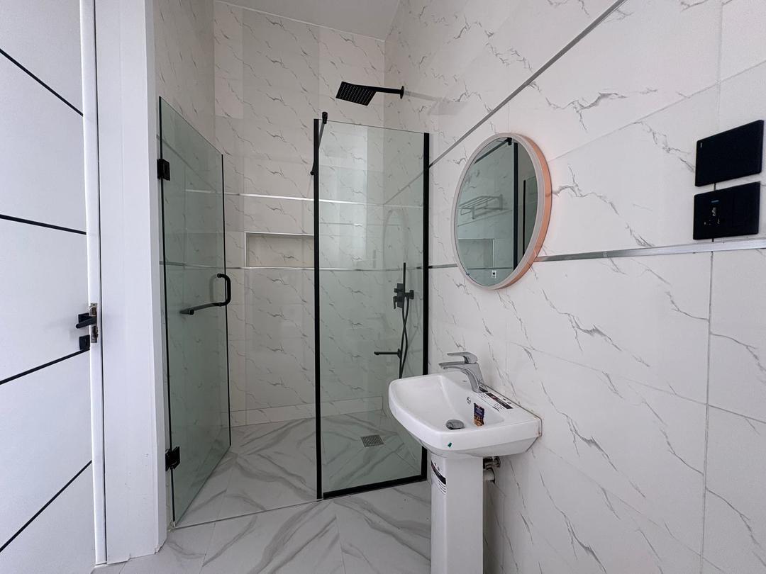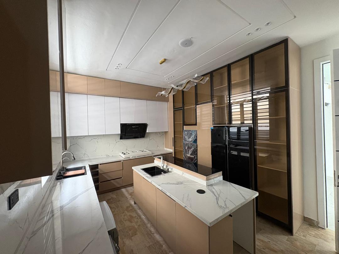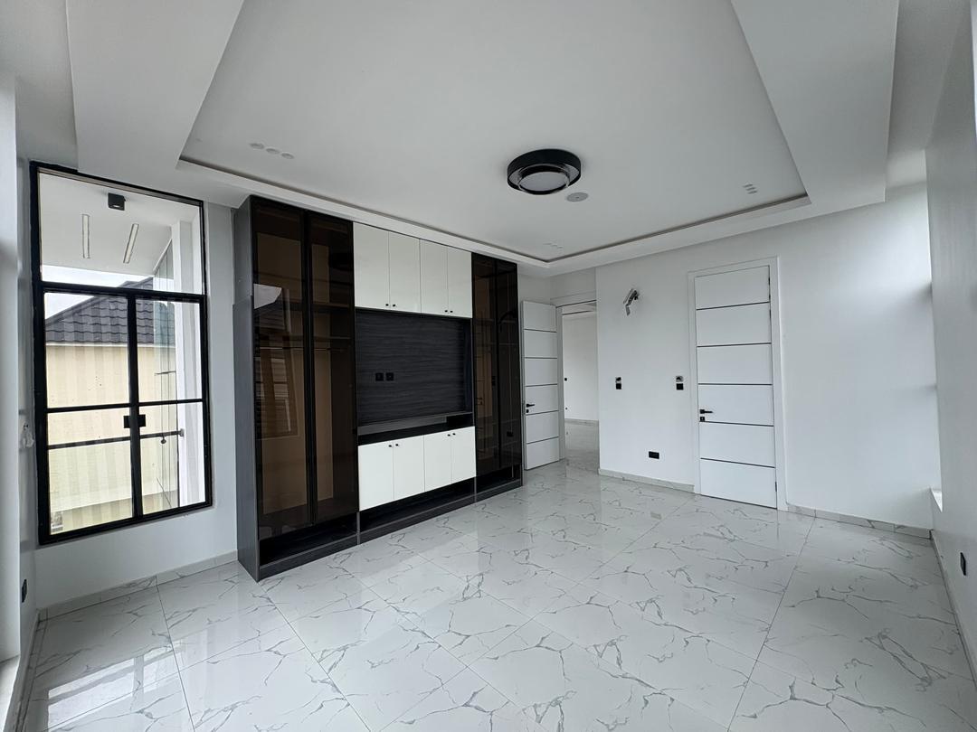 Spacious 5 bedroom detached duplex in Megamound Estate, Lekki. Features all rooms en-suite, swimming pool, fitted kitchen with cabinets, microwave oven, refrigerator and washing machine.