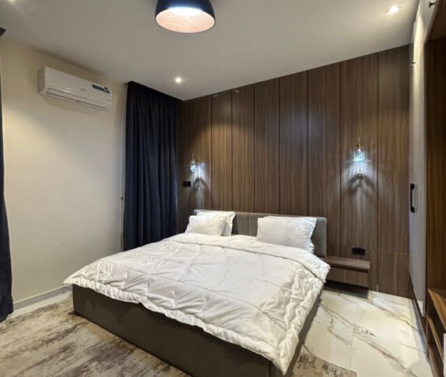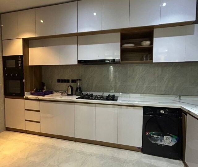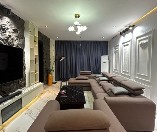The apartment features two spacious bedrooms, tastefully furnished with quality beds, wardrobes, and complementary fittings to create a relaxing and comfortable atmosphere. The living and dining area is elegantly arranged with modern furniture, providing a warm and inviting space for entertaining guests or enjoying quiet evenings at home. The kitchen is fully equipped with essential appliances, well-crafted cabinetry, and ample storage space, ensuring practicality and ease for daily use. Each area of the apartment is designed to maximize space, natural lighting, and ventilation, enhancing overall comfort.