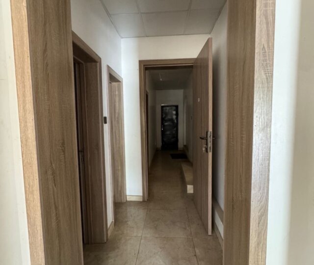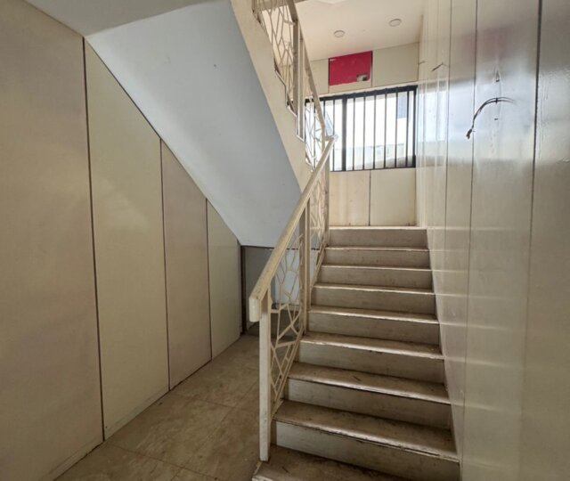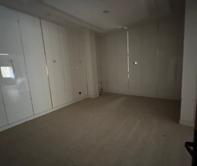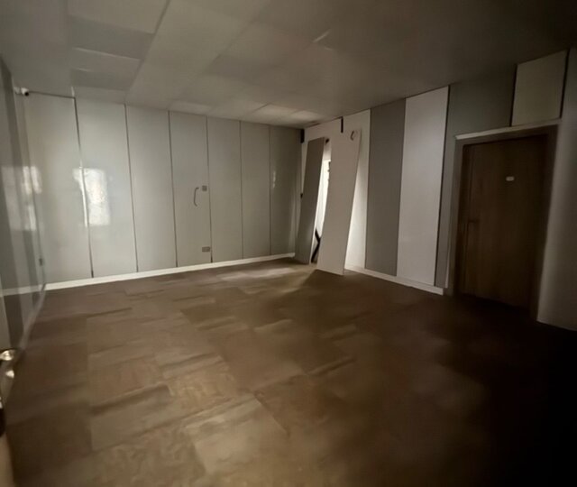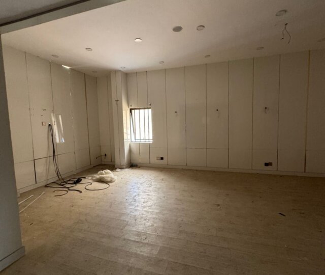The expansive interior features six large, well-ventilated rooms that can serve as executive offices, meeting rooms, or open-plan workspaces. High ceilings and wide windows allow for ample natural light, creating a bright and productive atmosphere. The modern bathrooms and fully fitted kitchen ensure comfort and convenience for staff and clients alike.
